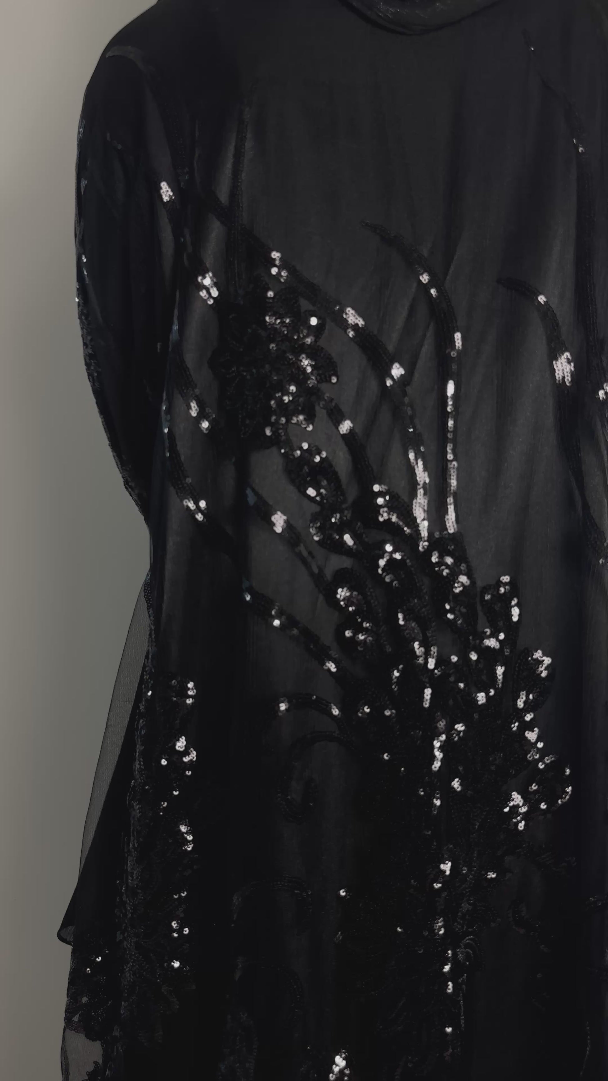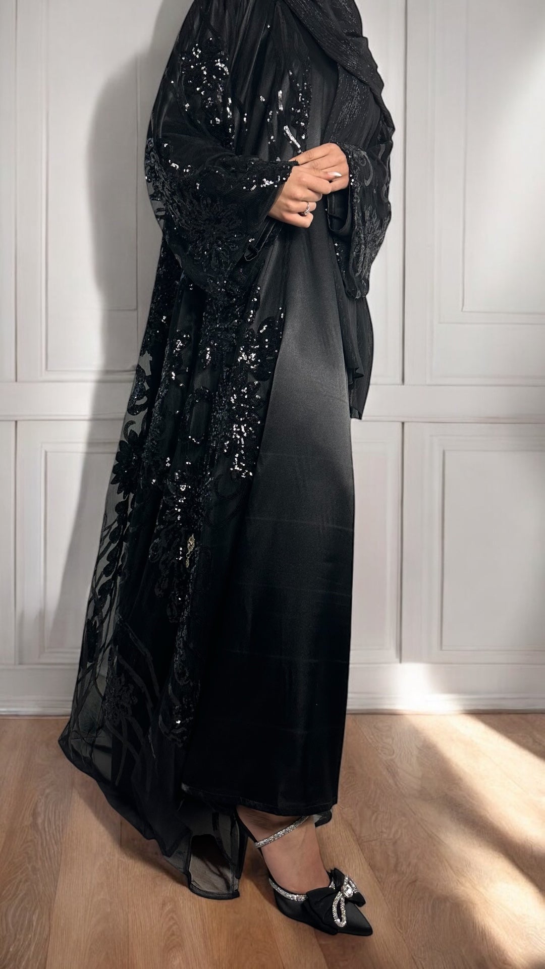 Step into sophistication with our Sequin Queen Set, meticulously crafted to enhance your presence at any special event. Delicately adorned with intricate floral black sequins, the open abaya radiates opulence and refinement, while the accompanying premium silky satin full-sleeved dress exudes grace and allure. Complete your ensemble with the luxurious evening shimmery large scarf for a seamless, breathtaking look that requires no additional accessories. Embrace the splendour of this ensemble and cherish every moment wearing it.