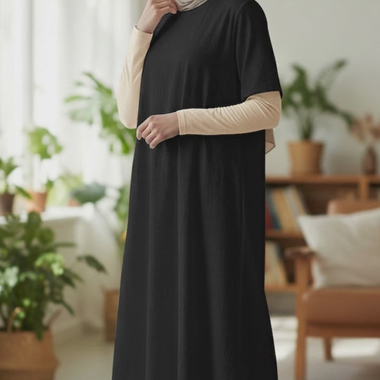 Exquisitely fashioned from premium crinkled crepe polyester fabric, this slip dress showcases a sophisticated textured finish, blending opulence with comfort. The discreet, short sleeved inner dress is ideal for layering under open abayas, kimonos, or even as a discreet underlayer for closed abayas.