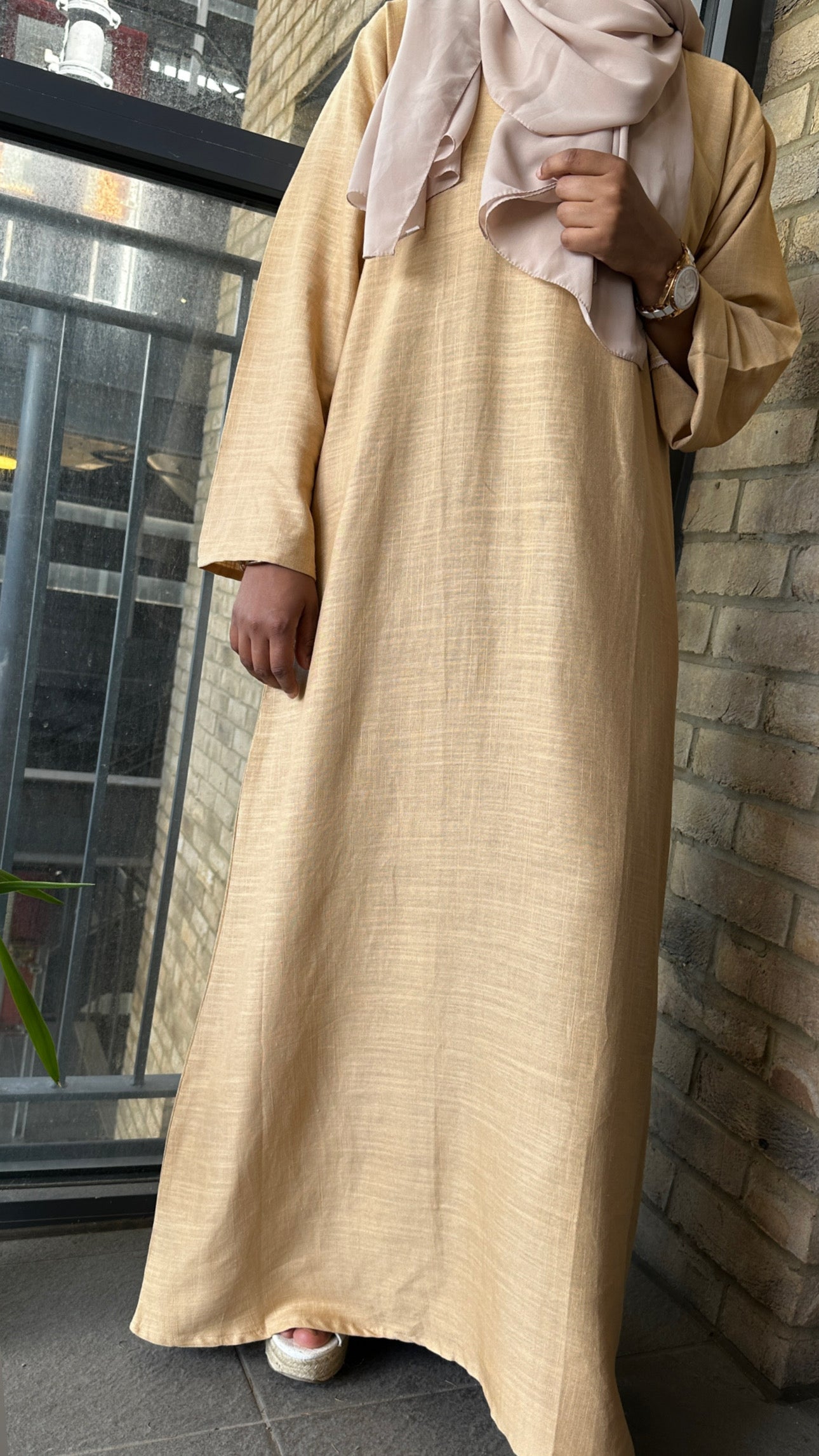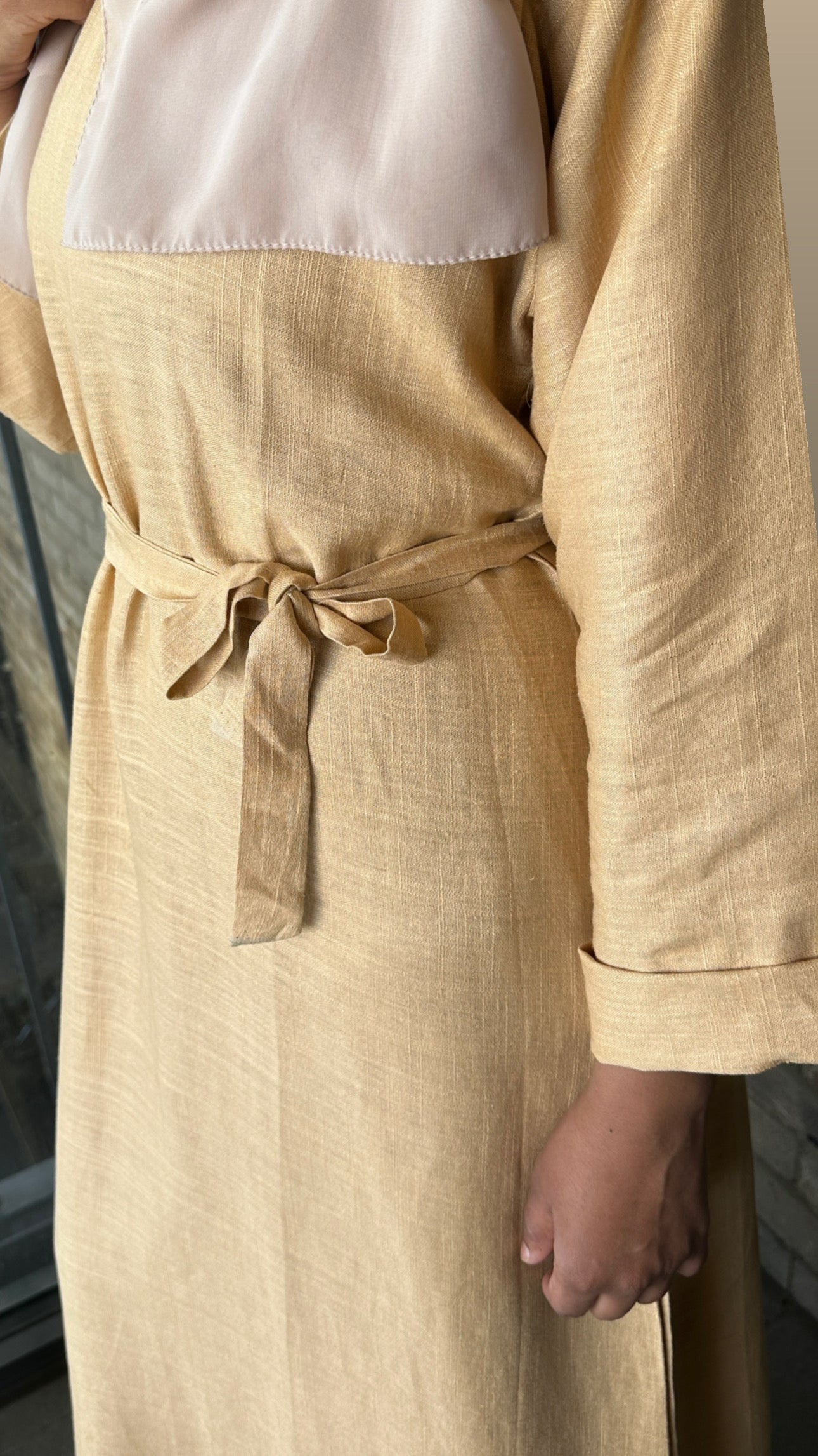Sunshine is a golden honey tone and made from soft Italian linen, the abaya is featherlike and breathable. Sunshine is a closed abaya or it can be worn as a maxi dress, and comes with a matching complementary belt.