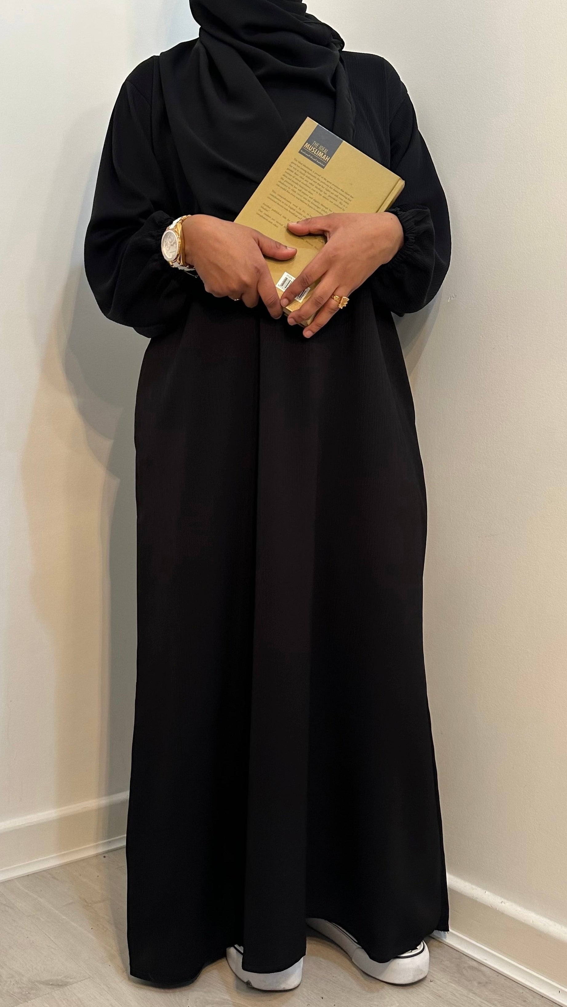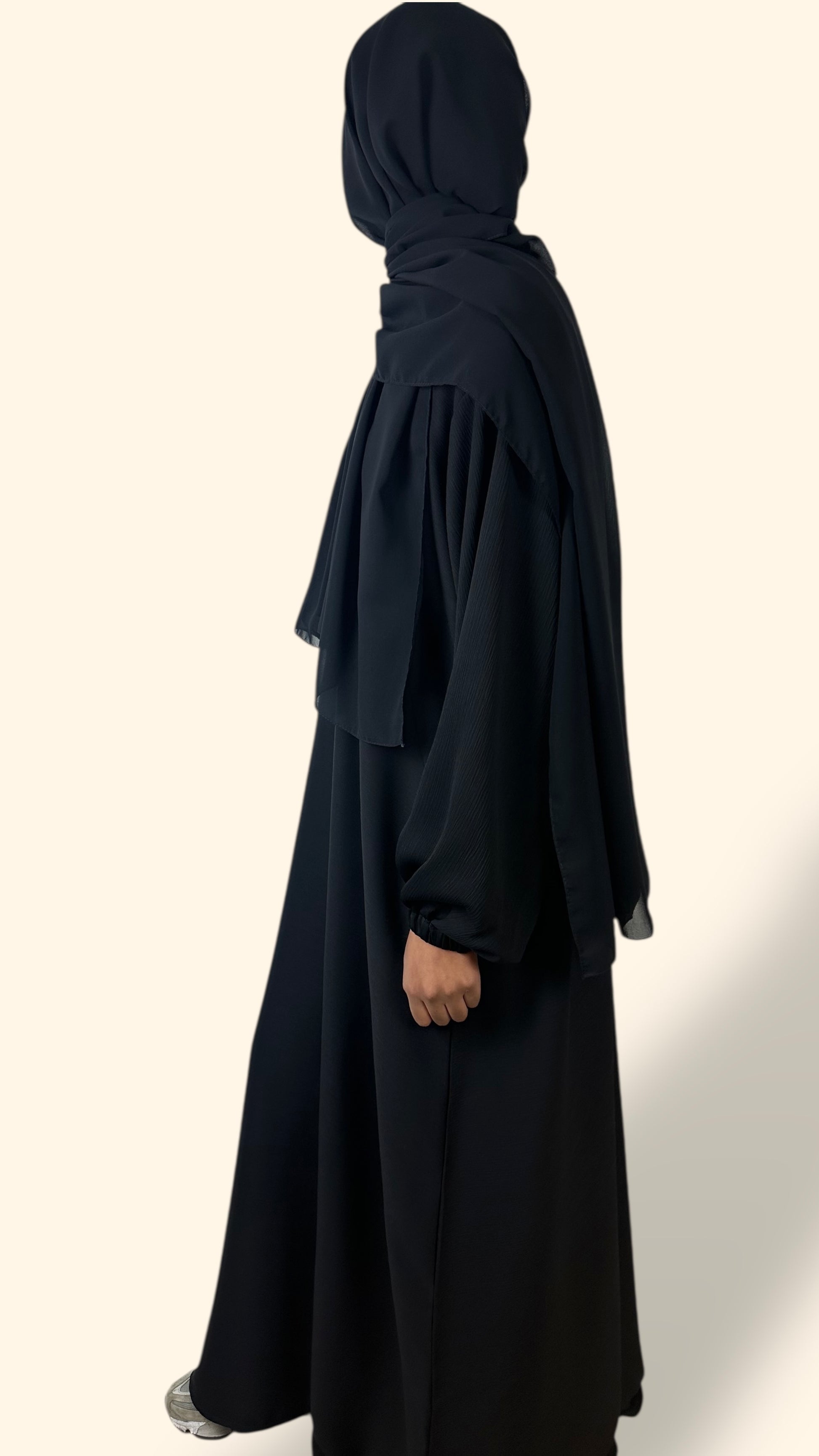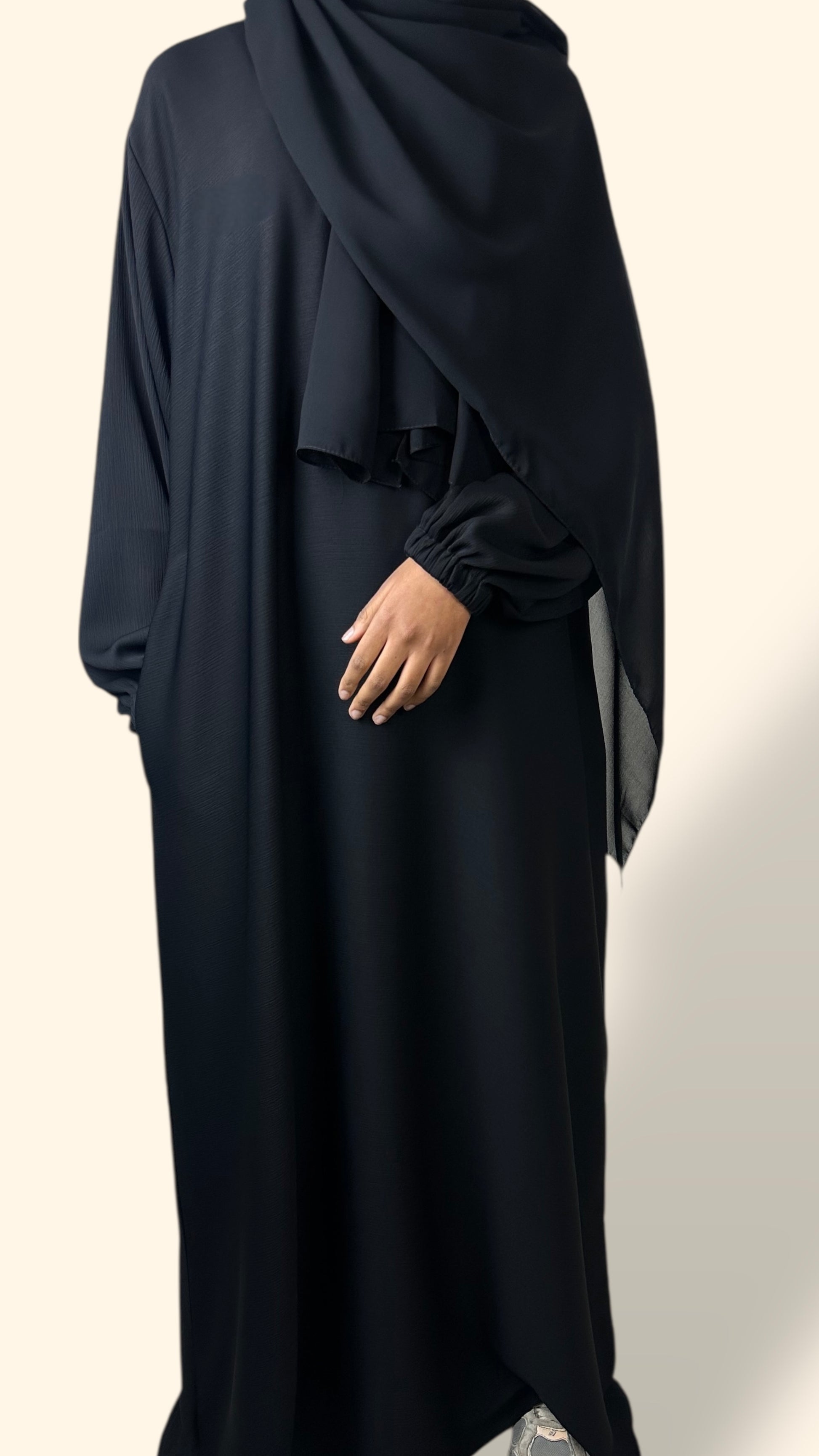 Zara abaya is wash and wear everyday abaya, has side pockets and comes with a matching black scarf.